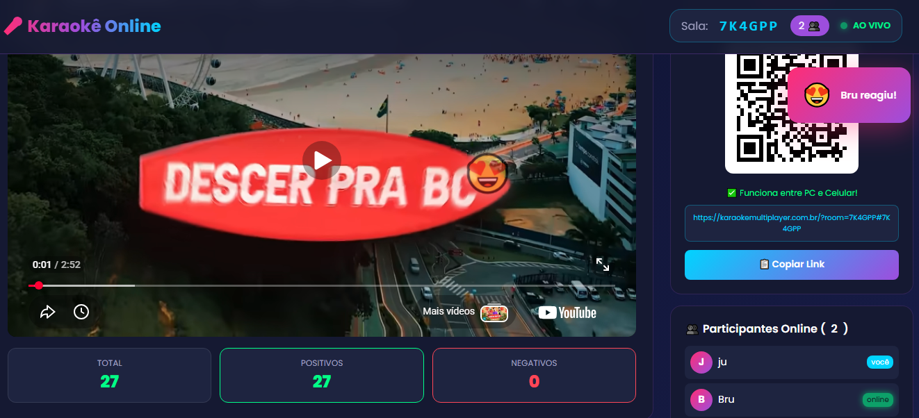 Adicione uma música à filaNo Karaokê Multiplayer, quem te dá a nota é a galera — com emojis em tempo real. Cante do sofá, da TV ou do celular. Sua plateia decide se você é lenda ou meme.